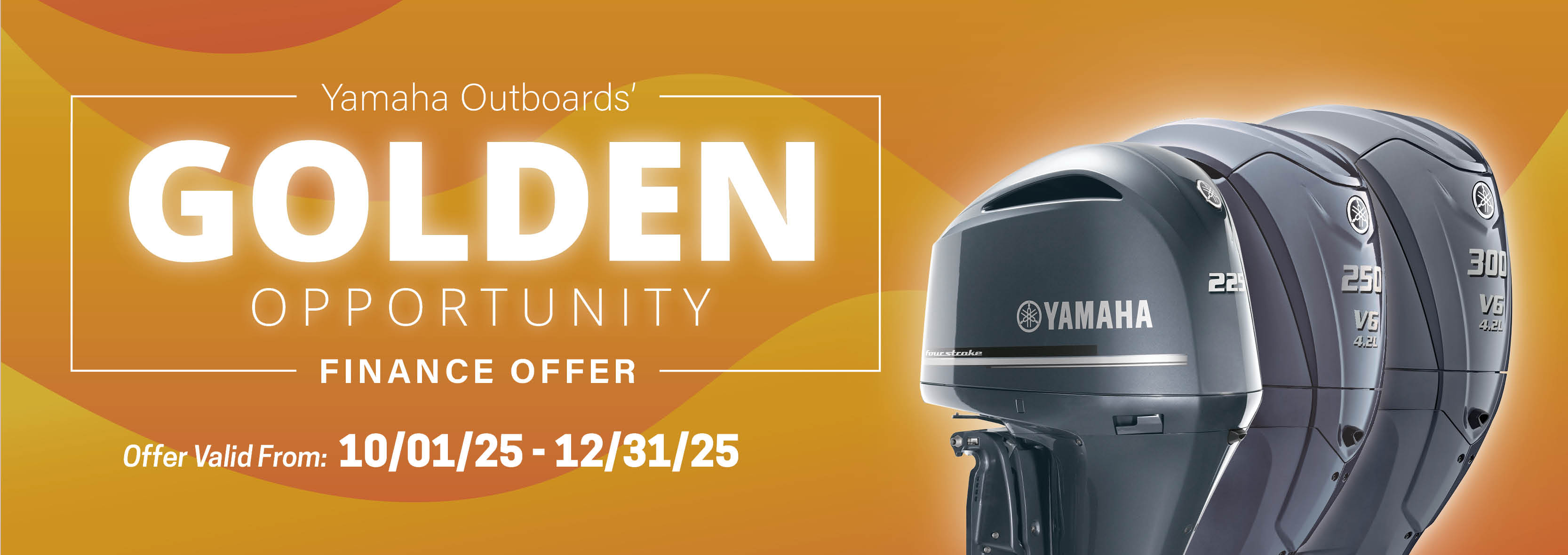 PROGRAM TERMS AND CONDITIONS: Available on approved purchases of new (unused and not previously warranty registered) V6 4.2L 225/250/300HP: DEC Non-Integrated Steering Yamaha outboard motors only (does not include V Max SHO V6 4.2L outboard motors) manufactured since January 2019 made on the Yamaha Credit Card issued by WebBank. Offer valid 10/1/2025 – 12/31/2025. Account must be open and current to be eligible for this offer. Introductory 0% APR for tier 1 - 3 financing with minimum payments of 1.00% of the purchase price balance are effective for initial 12 months based on creditworthiness. After the 12-month introductory period, standard APR 15.99%, 18.99%, 20.99% with minimum monthly payments shall be due equal to the greater of 1% of existing balance plus standard interest charges based on creditworthiness, late fees and late payment amounts, or $25 until the purchase price is paid in full. Minimum interest charge $2 per month. Promotional rates are based on creditworthiness. Not all applicants will qualify.